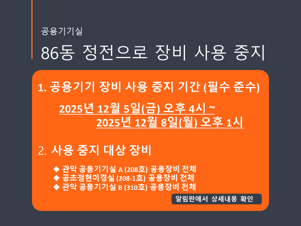 [업무연락][관악] 86동 정전으로 인한 공용기기실 장비 사용 중지 안내