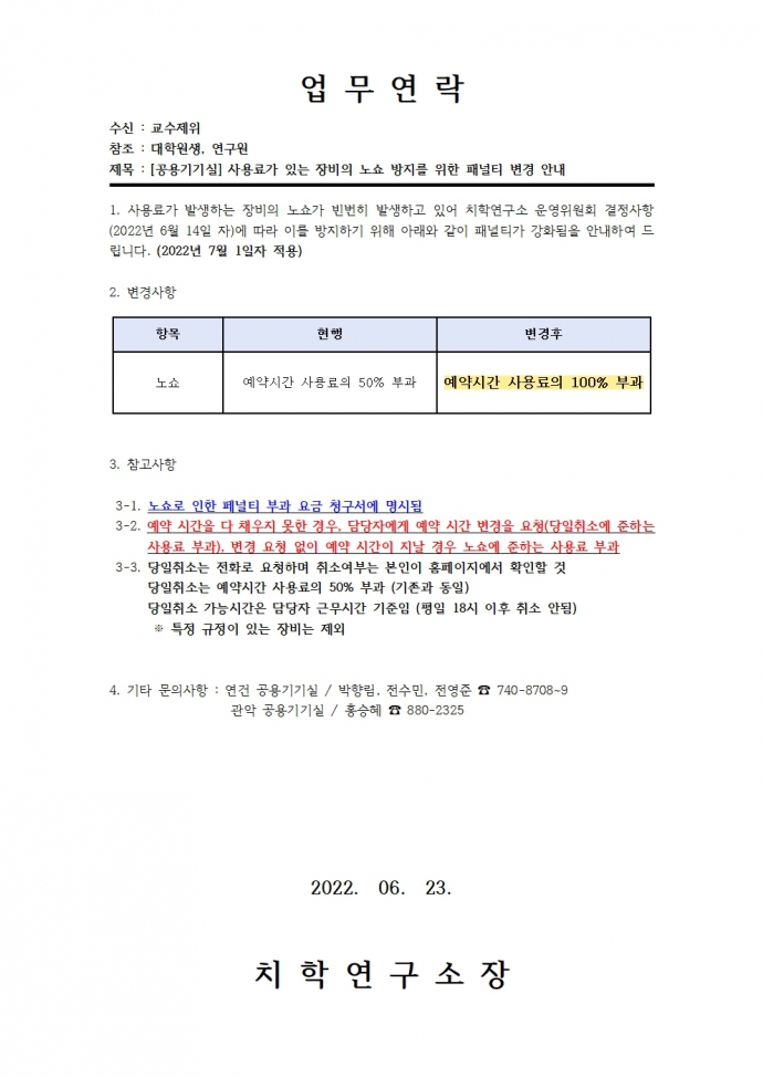 [업무연락] 사용료가 있는 장비의 노쇼 방지를 위한 패널티 변경 안내