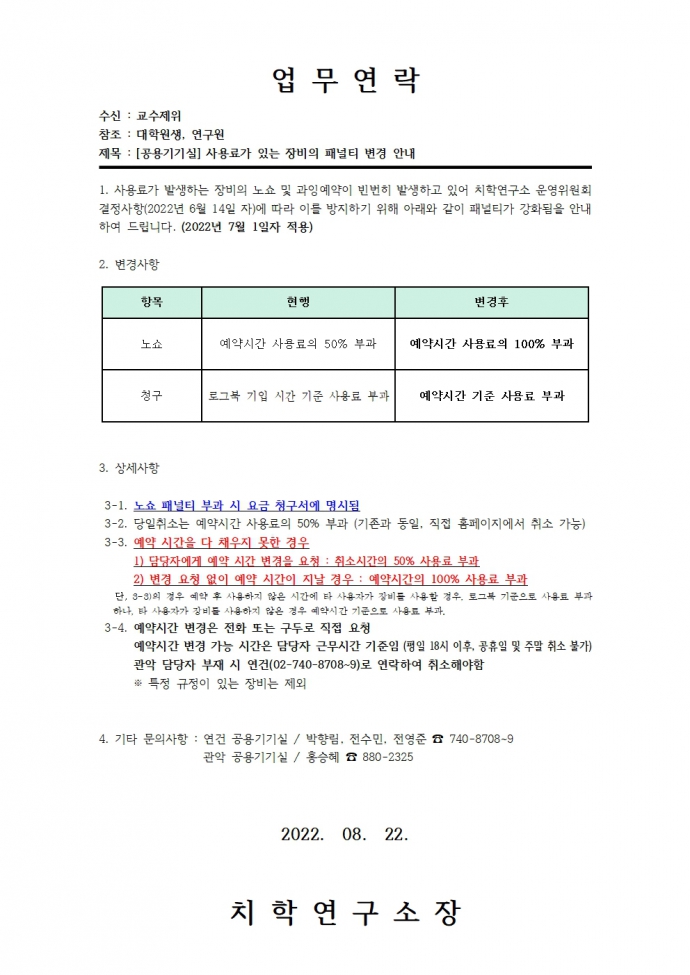 [업무연락][공용기기실]사용료가 있는 장비의 패널티 변경 안내