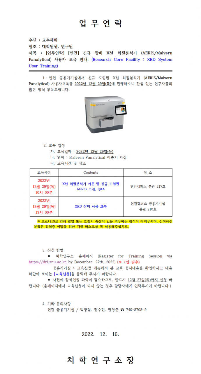 [연건][신규장비] X선 회절분석기 (AERIS/Malvern Panalytical) 사용자 교육 안내