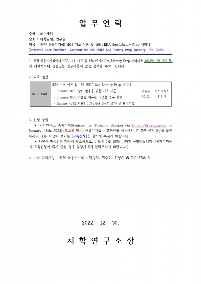 [업무연락][연건]NGS 기초 이론 및 16S rRNA Seq Library Prep 세미나