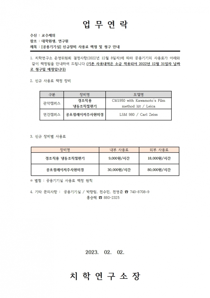 [업무연락] 신규장비 사용료 책정 및 청구 안내