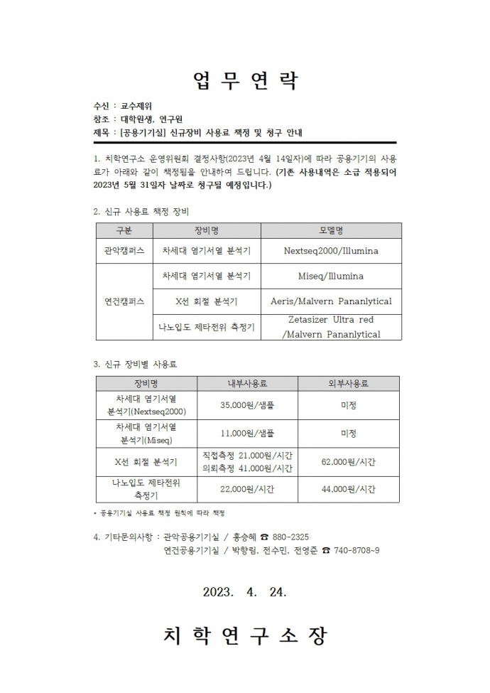 [업무연락] 신규장비 사용료 책정 및 청구 안내