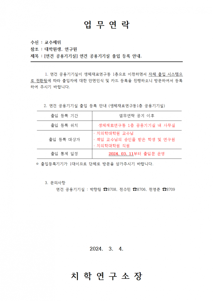 [업무연락][연건 공용기기실] 연건 공용기기실 출입 등록 안내