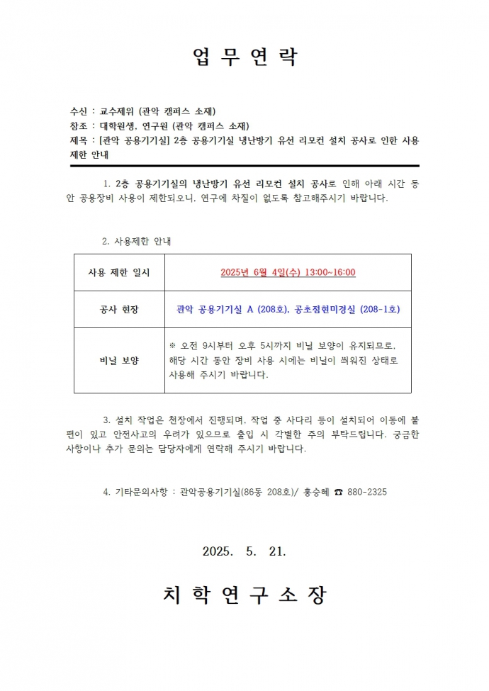 [관악] 2층 공용기기실 냉난방기 유선 리모컨 설치 공사로 인한 사용 제한 안내