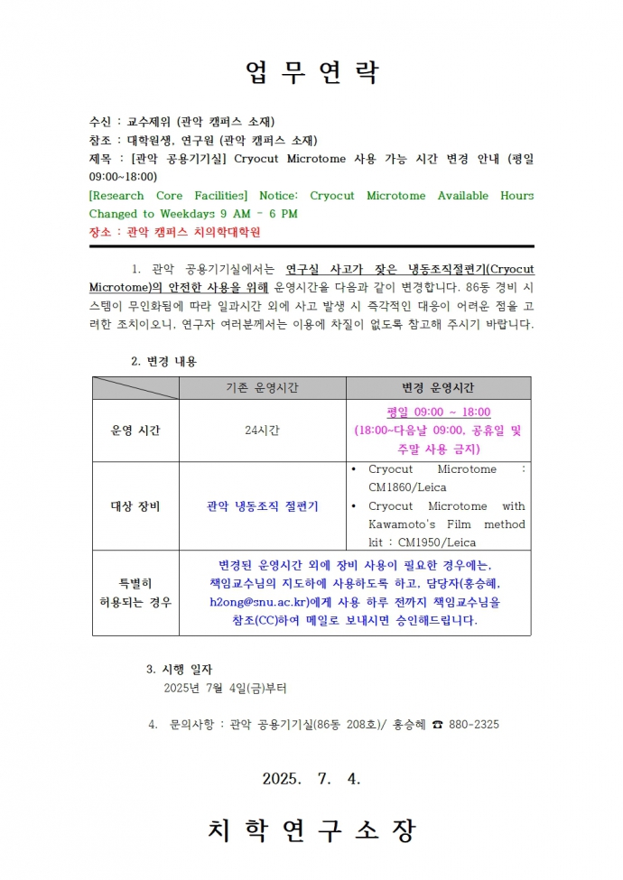 [관악] Cryocut Microtome 사용 가능 시간 변경 안내 (평일 09:00~18:00)