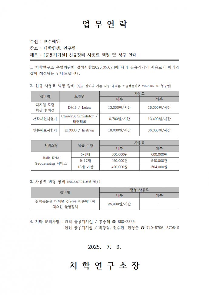 [업무연락][공용기기실] 신규장비 사용료 책정 및 청구 안내