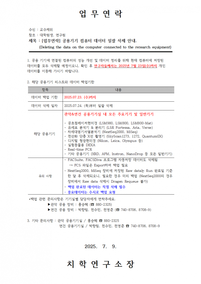 [업무연락][공용기기실] 공용기기 컴퓨터 데이터 일괄 삭제 안내