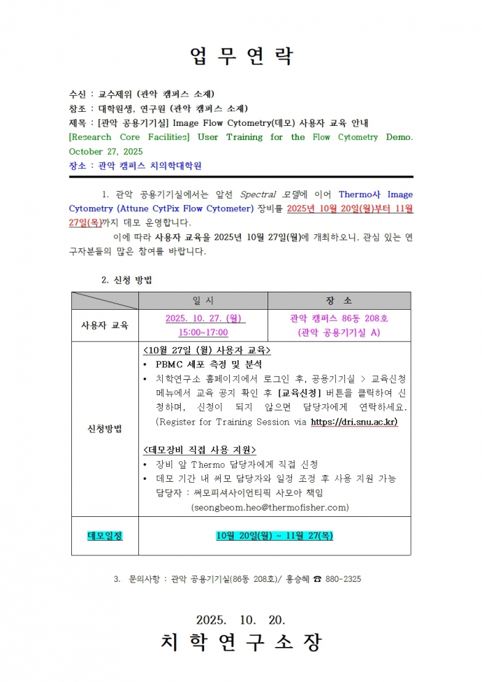 [업무연락][관악] Image Flow Cytometry(데모) 사용자 교육 안내