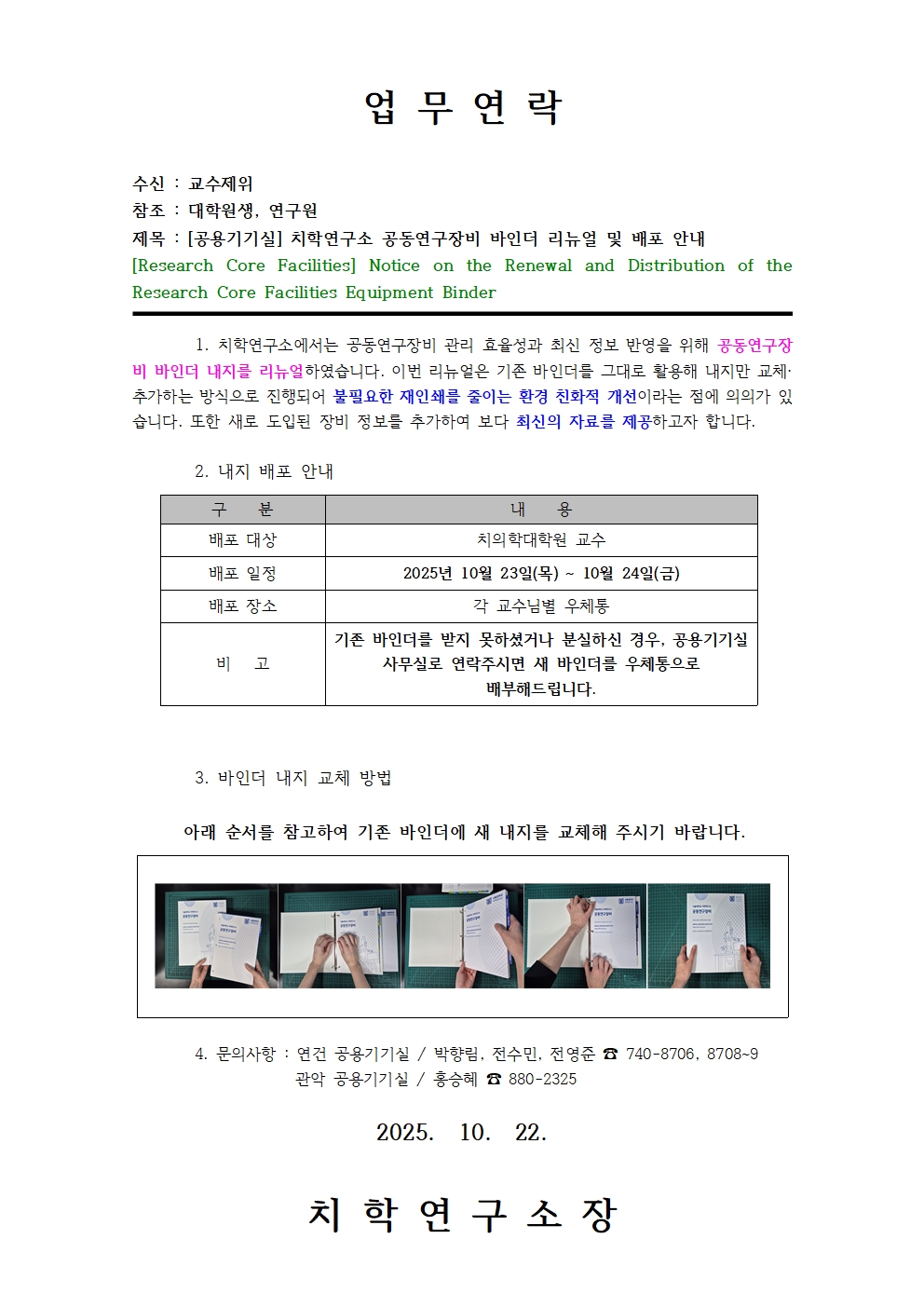 [업무연락] 치학연구소 공동연구장비 바인더 리뉴얼 및 배포 안내