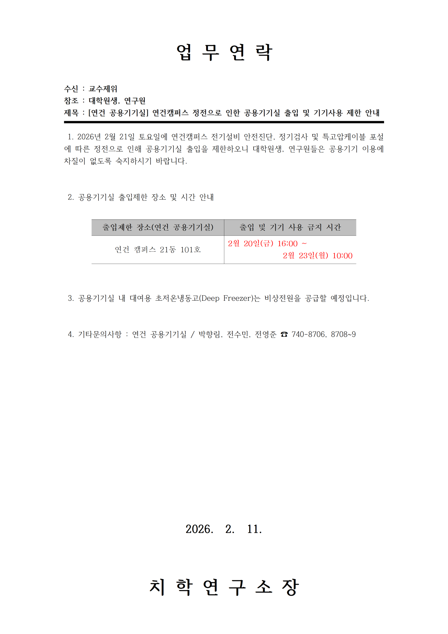 [업무연락][연건공용기기실] 연건캠퍼스 정전으로 인한 공용기기실 출입 및 기기사용 제한 안내