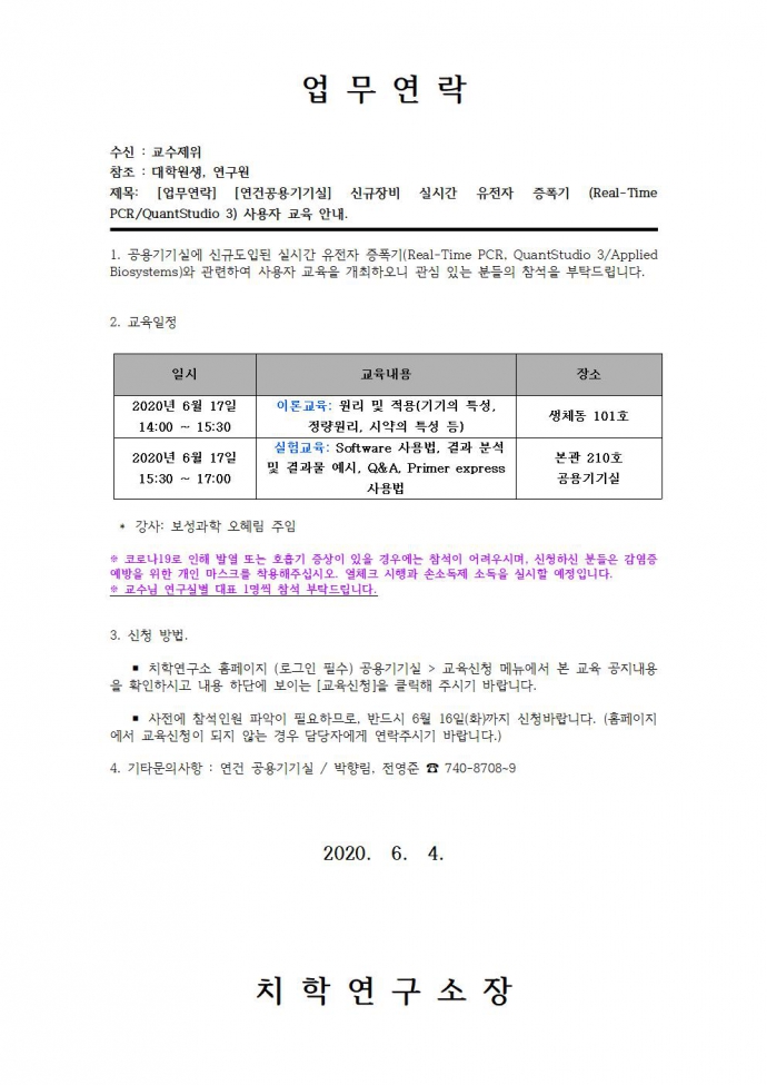 [연건] 신규장비 실시간 유전자 증폭기 (Real-Time PCR/QuantStudio 3) 사용자 교육 안내.