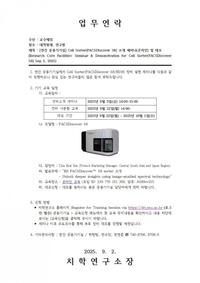 [연건] Cell Sorter(FACSDiscover S8) 소개 세미나(온라인) 및 데모